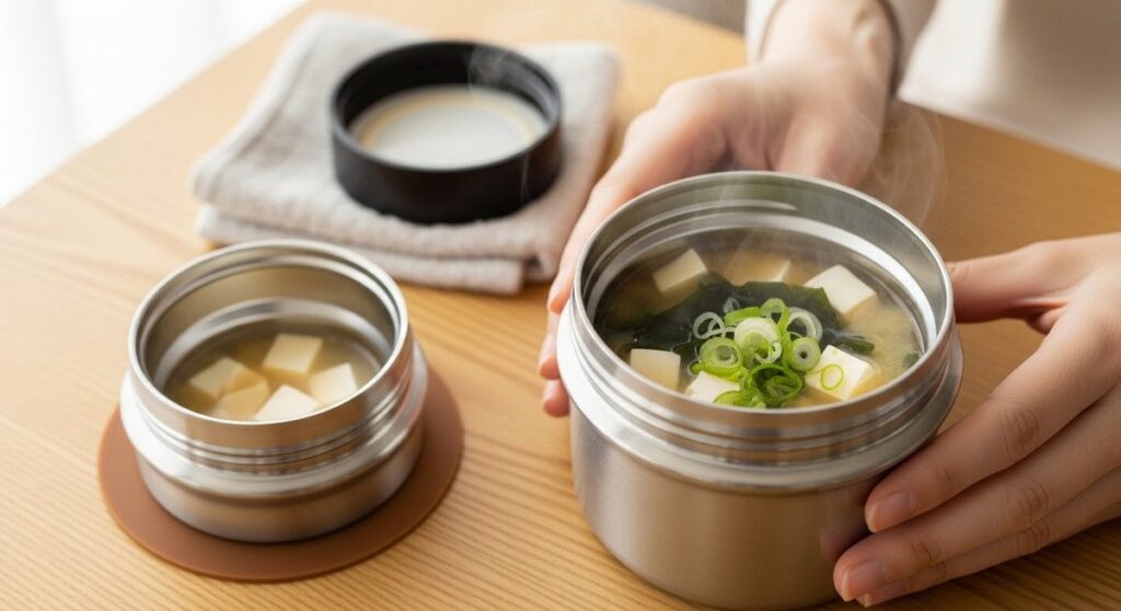 スープジャーで味噌汁を安全に持ち運ぶための基本と注意点を紹介します。容器の予熱や味噌汁の適切な温度、避けるべき具材について具体的に解説します。暑い季節や前日作りの扱い方、保冷利用のコツも分かりやすくまとめました。