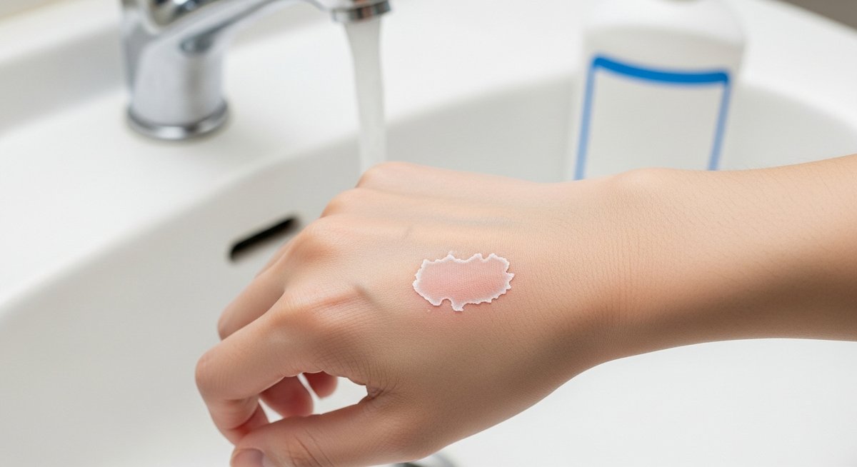 こすると皮膚のバリアがさらに傷つき、薬剤が深く入ってしまうことがあります。摩擦で皮膚が剥がれ、水ぶくれや広がりの原因になるため、こすらずに流水で流すのが安全です。
