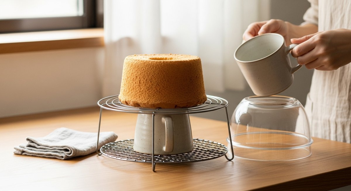 シフォンのふわふわ感を守るには、逆さにしてゆっくり冷ますことが基本です。瓶がない場合も、マグカップや水筒、ペットボトルなど身近な器具を安定させて代用できます。支えの安定性と通気性、急冷を避けることを意識してください。