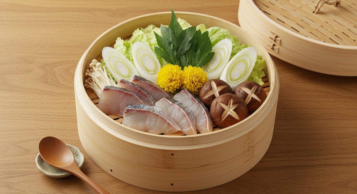 主な食材は白身魚や鯛、鶏肉や豚薄切り、季節の根菜や葉物です。組み合わせはシンプルで、魚介類と野菜を同じ蒸し器に並べ、酒や昆布だしで下味をつけて蒸すのが基本です。調味は塩、酒、薄口醤油、ポン酢などが使われ、仕上げに刻み葱や生姜を添えると香りが立ちます。