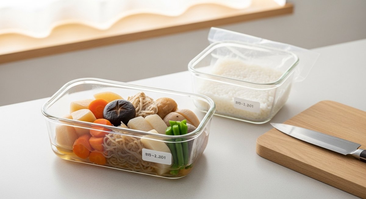 煮物はあらかじめ食べ切りサイズに小分けしておくと、頻繁に開閉せずに済み、品質を保てます。小分けすると再加熱の際も均一に温めやすく、味のくずれを防げます。